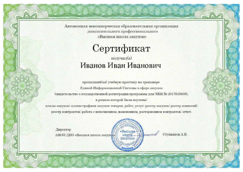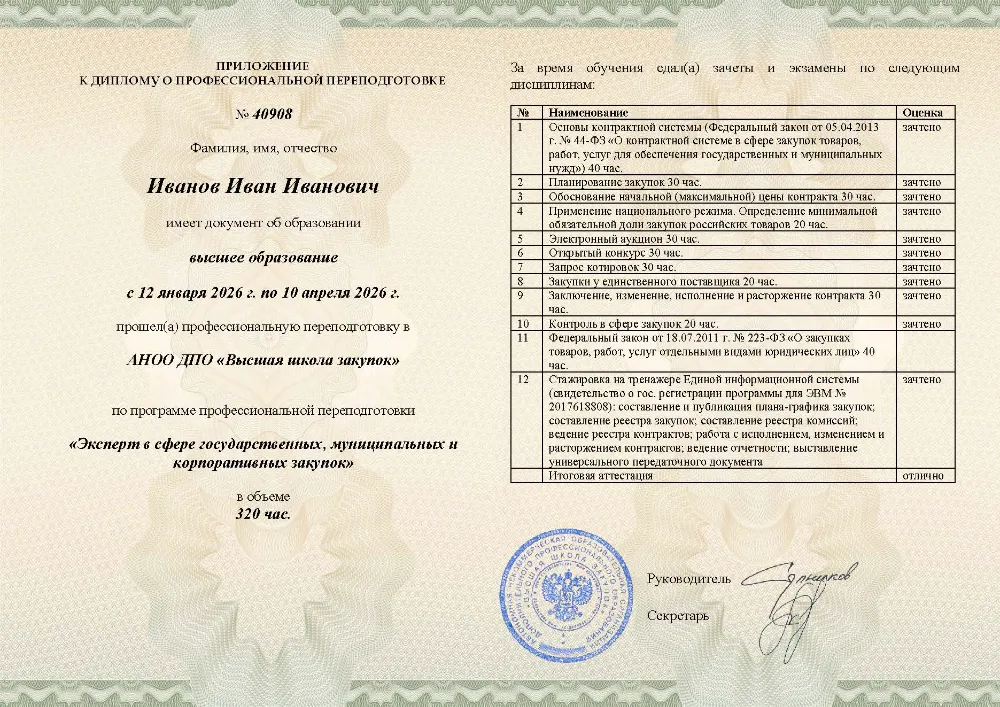 Вы получаете диплом о профессиональной переподготовке с присвоением квалификации эксперта. Сведения об обучении в Кирове в обязательном порядке вносятся в реестр Рособрнадзора, подтверждая ваше право занимать руководящие должности в контрактных службах.