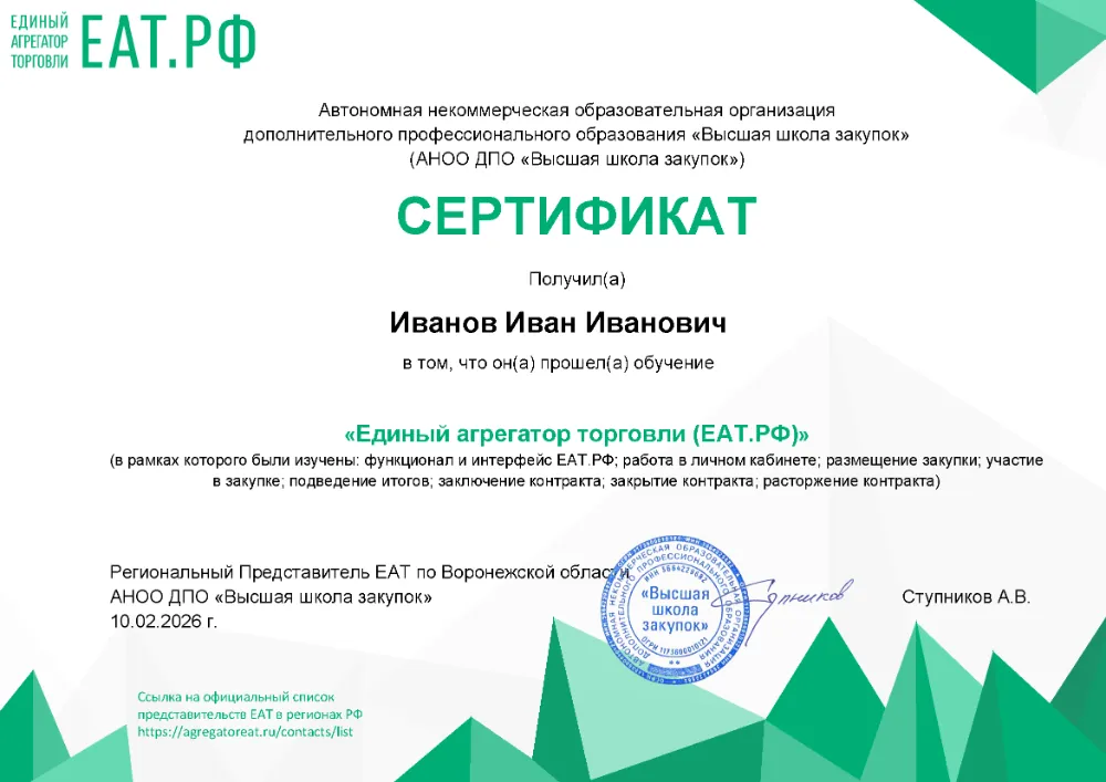 АНОО ДПО «Высшая школа закупок» является официальным представителем ЕАТ.РФ