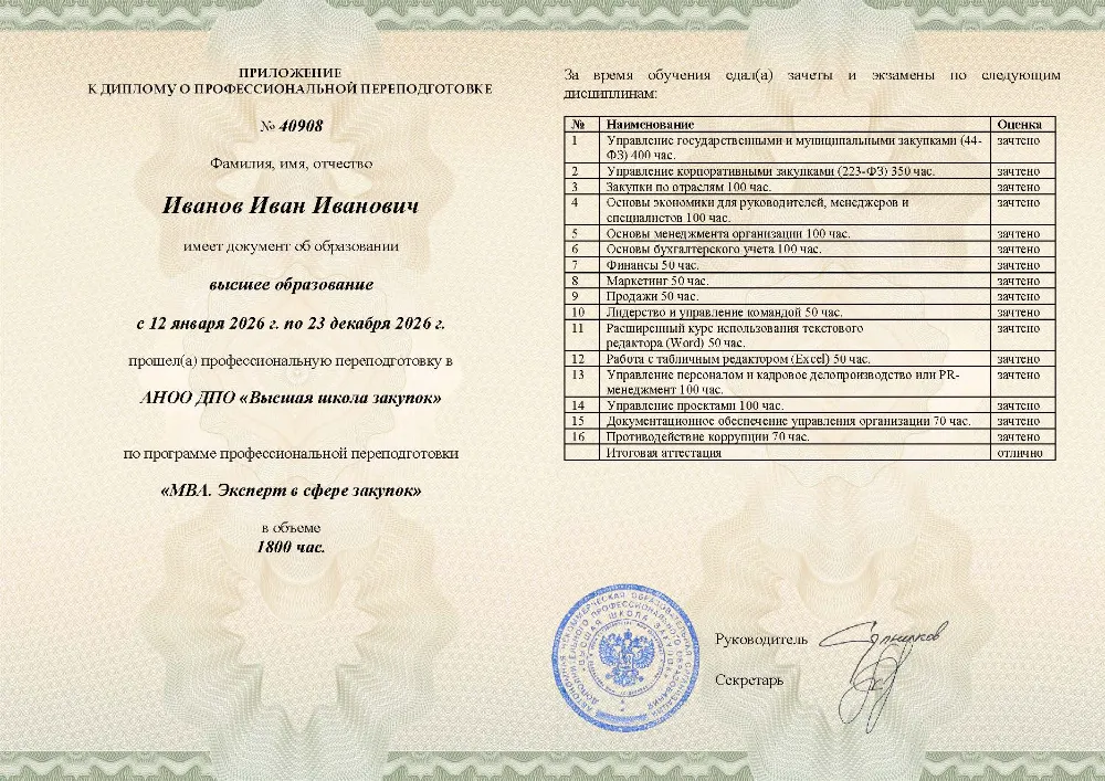Вы получаете престижный диплом о профессиональной переподготовке с присвоением квалификации эксперта (MBA). Высшая школа закупок (fz44.org) в обязательном порядке вносит сведения об обучении в Кирове в реестр Рособрнадзора, подтверждая ваш высший квалификационный статус.